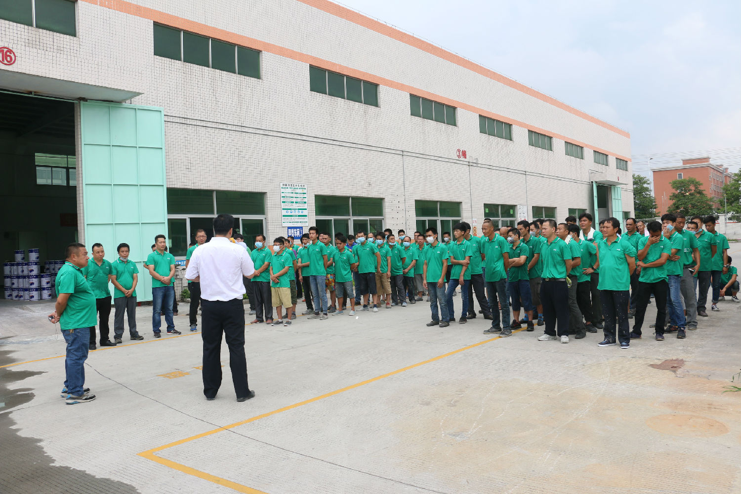 演练内容为木器漆车间附近发现火情。演练准时开始:发现“火情”后,公司立即启动火灾应急预案,保安部即时拨打119报警,义务消防队及时赶到现场并利用灭火器扑救初期火灾,紧急疏散全体员工有序撤离事故现场。